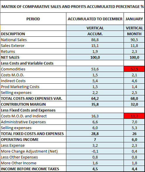 For it, he is very recommendable to have a comparison pattern, which takes shape with two parameters that are to say: the earnings statement of the previous exercise (where we are) and the projected one for the exercise in the course (to where we want to arrive) in agreement with the strategic planning. For both cases, a vertical analysis is fundamental in that it indicates the participation of each one of the debts as a percentage of the income and allows us to make questions to the games that do not obey logic.